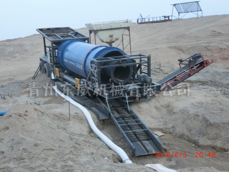 移动淘金车是一种在陆地上可移动的淘金设备,它有着结构紧凑、整体性强、重量轻、处理量大、操作简单、工作可靠,且易维护、移动方便等特点。该设备主要用于旱地沙滩、河道是一种重力选矿设备主要用于沙金矿的和脉矿中的单体金的回收工作。淘金车的主要组成部分有:料仓、滚筒筛、选矿设备(例如溜槽、溜槽或者尼尔森选矿机等)、移动车架、供水系统、电控柜等组成,整套淘金工作在此淘金车上进行,开采完矿区某个区域,再很方便的移动到另一个区域继续开采。
