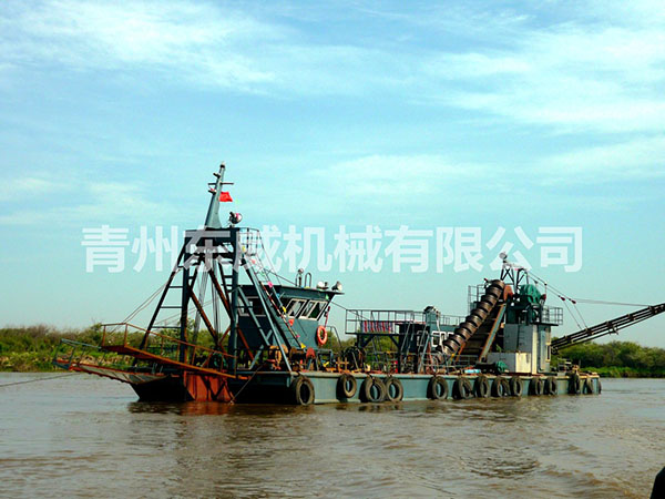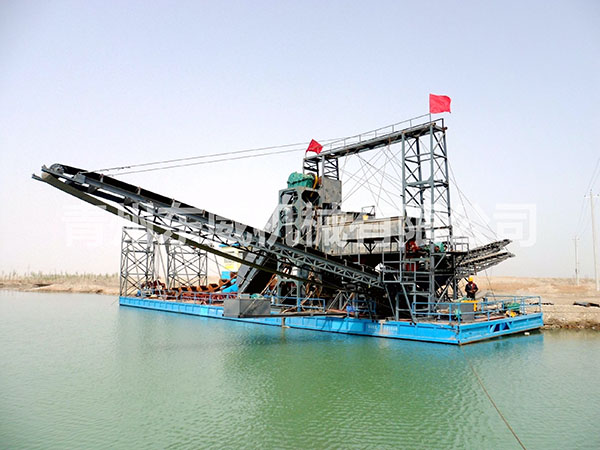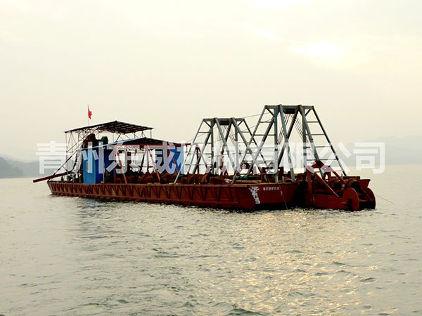 链斗式挖沙船可根据客户性能要求及工矿作业特点设计制造。物料挖掘出来并由输送机或输送泵输送至岸边、运沙船的功能;浮体采用横骨架式分体箱形结构,转运时可拆装后装车。装有定位设备、链斗挖掘装置、桥架升降装置及皮带输送机等。水下杆是由安装在浮体上的绞车实现升降,砂石料通过链斗装置挖掘上来,由输送机或输送泵输送到岸上或运沙船。